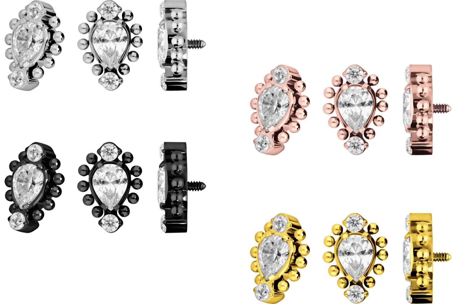 Dieser zeitlos schöne Schraubaufsatz in Form von drei funkelnden Kristallen, die von mehreren Kugeln umrahmt werden, wurde speziell für unsere Innengewinde-Piercings