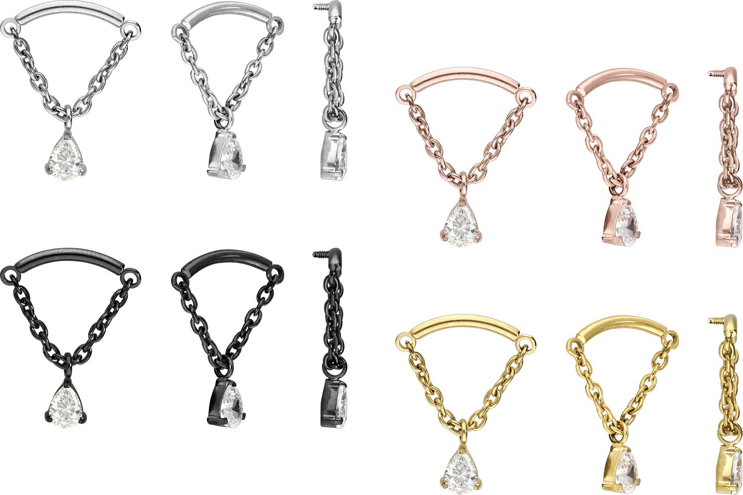 Dieser zeitlos schöne Schraubaufsatz in Form eines Bogens, an welchem eine Kette mit einem beweglichen Kristalltropfen befestigt ist, wurde speziell für unsere Innengewinde-Piercings