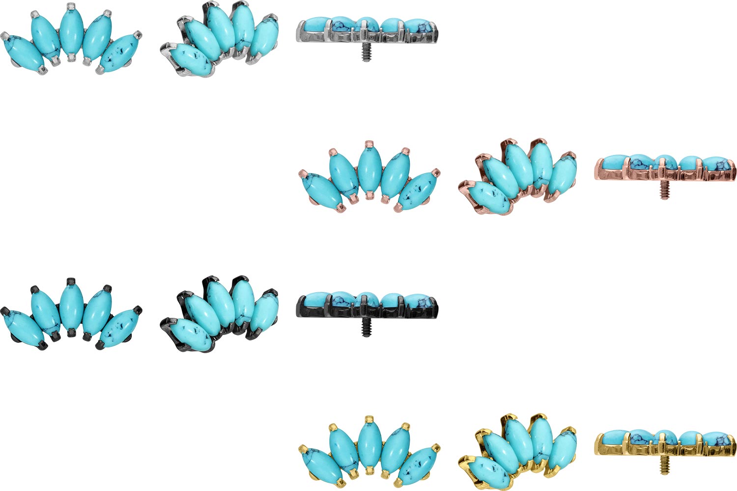 Dieser zeitlos schöne Schraubaufsatz in Fom eines Bogens, welcher mit synthetischen Türkisen bestückt ist, wurde speziell für unsere Innengewinde-Piercings entwickelt und