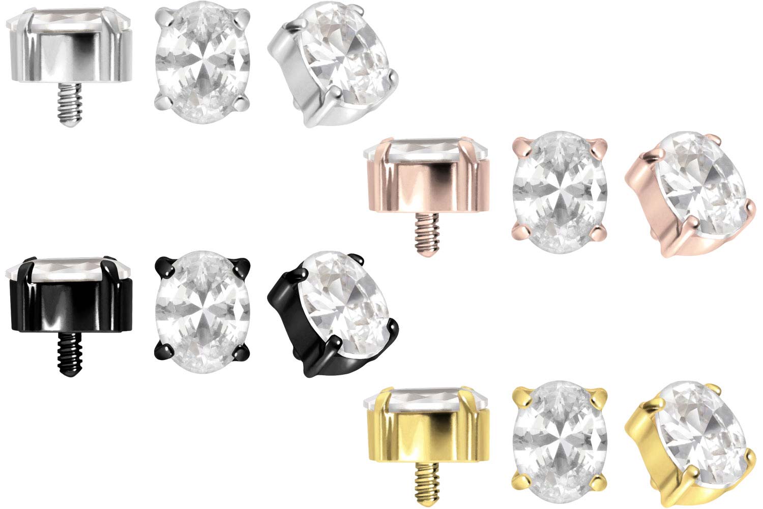 Dieser zeitlos schöne Schraubaufsatz in Form eines Kristallovals mit Fassungen wurde speziell für unsere Innengewinde-Piercings entwickelt und besteht aus