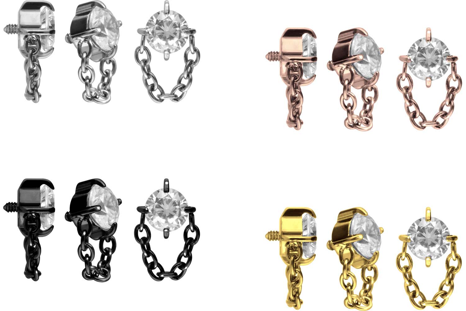 Dieser zeitlos schöne Schraubaufsatz in Form eines funkelnden Kristalls, an welchem eine Kette befestigt ist, wurde speziell für unsere Innengewinde-Piercings