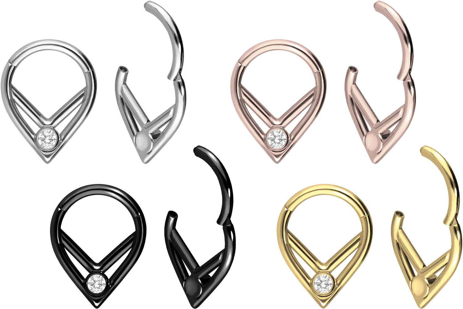 das Piercing mit einer kratzfesten PVD-Beschichtung überzogen. Die geschickte Kombination aus dem funkelnden Kristall mit den beiden spitz zulaufenden Ringen verleiht dem Schmuckstück einen einzigartigen Charme. Ob am Ohr, der Nase, oder der Lippe - unsere Clicker sind für die verschiedensten Piercingstellen geeignet. Dieser Clicker ist mit einer Stabstärke von 1,2 mm und einem Innendurchmesser von 8 mm erhältlich.