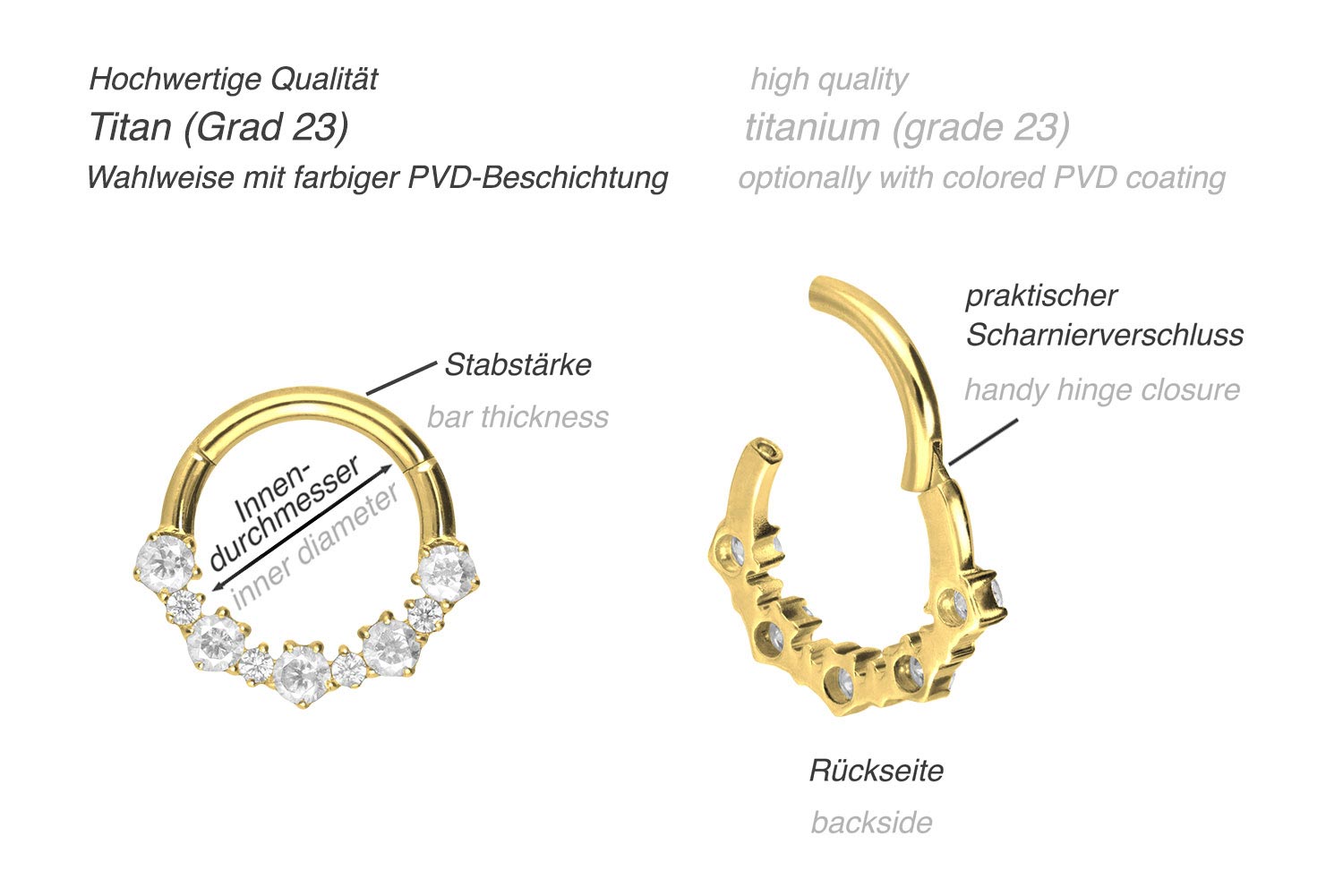 das Piercing mit einer kratzfesten PVD-Beschichtung überzogen. Die