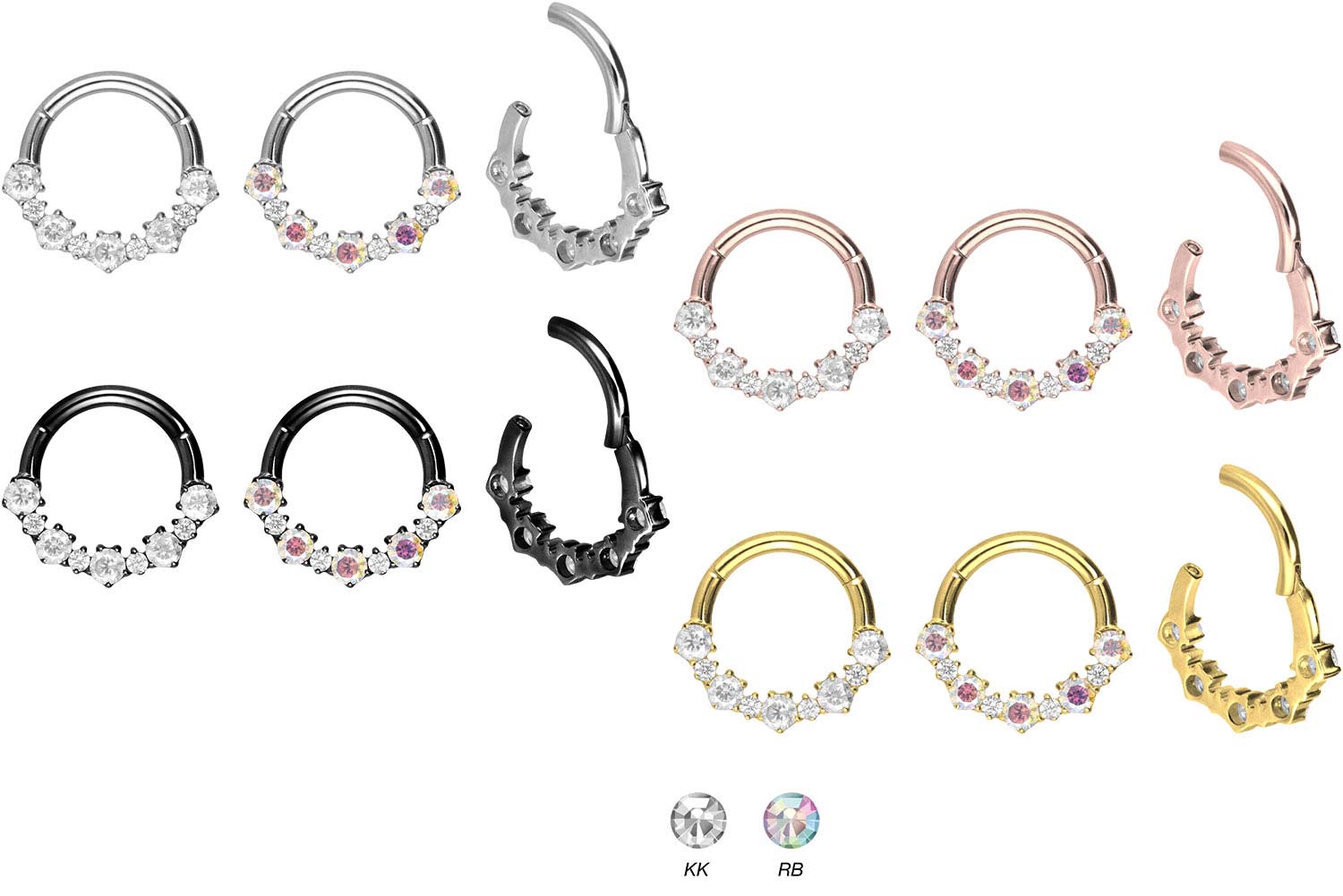 wunderbar schimmernden Kristalle mit Fassungen lassen das Schmuckstück in seiner ganzen Pracht erstrahlen. Ob am Ohr, der Nase, oder der Lippe - unsere Clicker sind für die verschiedensten Piercingstellen geeignet. Zur Auswahl steht der